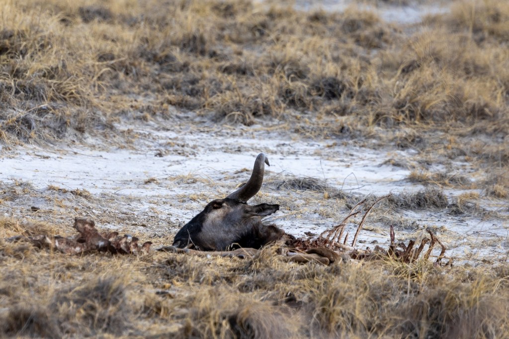 As we slowly cruised along the dirt roads, our first encounter was a powerful reminder that this isn’t a wildlife documentary—it’s real life. Just off the side of the road, partially hidden in the grass, lay the carcass of a wildebeest. Nature’s reality check. The body looked like it had been picked over by scavengers, possibly the aftermath of a lion hunt from a few nights ago. The leftover bones, and the silence that hung in the air around it, brought a quiet mood to the car. Life and death are two sides of the same coin out here.