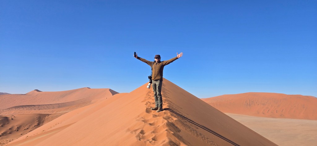 Our first stop in the Namib Desert was Dune 45, one of the most famous dunes in the world. This towering giant rises 45 meters (148 feet) above the surrounding sand, offering spectacular views of the surrounding landscape. From the peak, we could see the endless stretch of red dunes in all directions—shifting sand in every hue of orange, red, and gold.