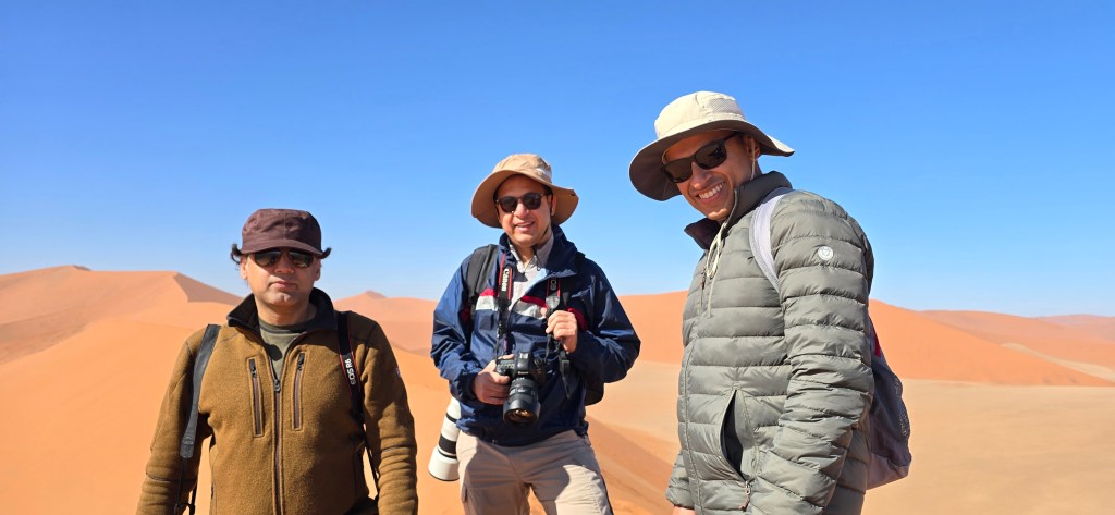 The descent from Dune 45 was a lot easier than the climb up, thanks to the soft sand beneath our feet. However, it still wasn’t without its challenges. As we slid down, our boots filled up with coarse sand, making each step feel like we were dragging an extra weight. The wind had picked up slightly, sending sand swirling around us, but the views of the vast desert around us more than made up for the discomfort.
