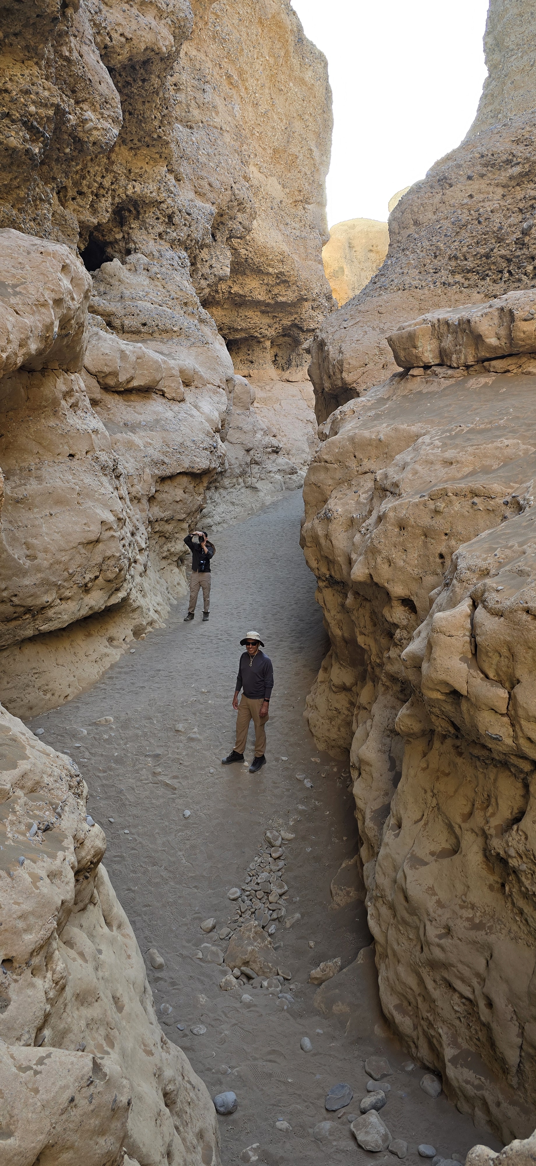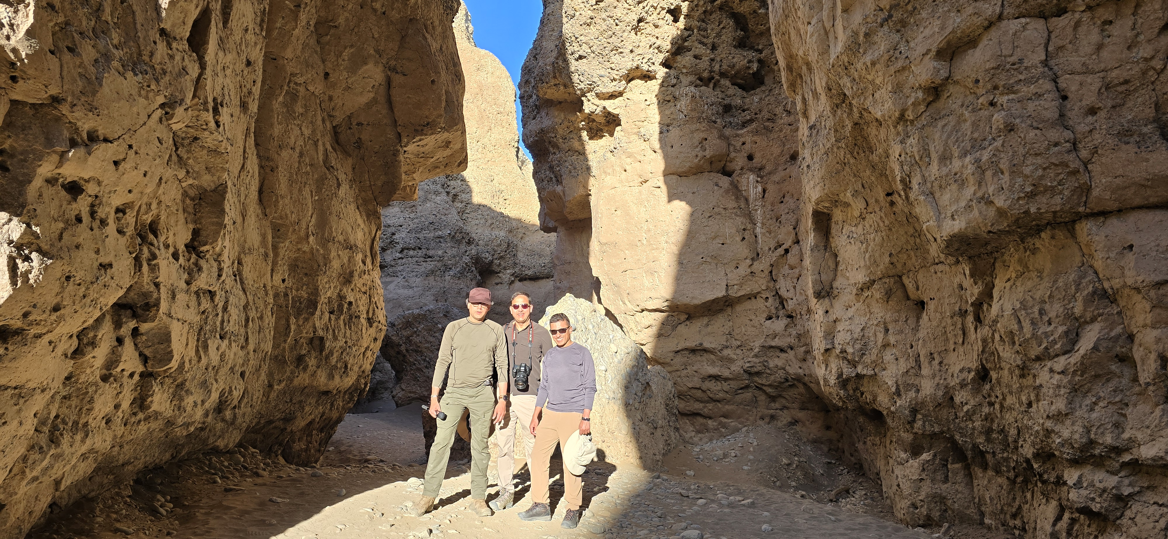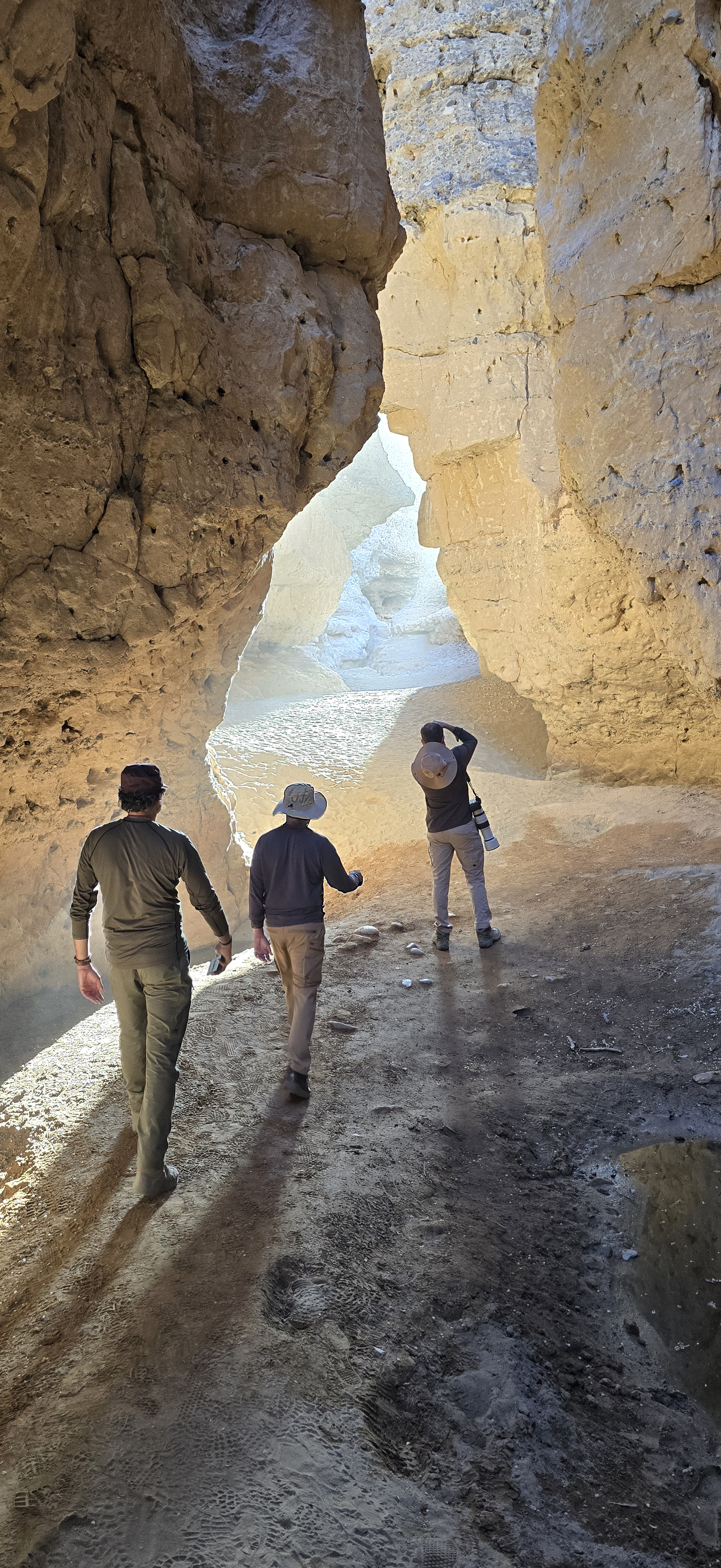 The temperatures were much more bearable now, around 80°F (27°C), making it a welcome relief after the 90°F (32°C) heat earlier in the day. The canyon is home to some wildlife, including birds and baboons. As we made our way through the narrow passages of the canyon, the distant calls of baboons echoed off the rocky walls, reminding us of the desert’s wild pulse, even in this isolated spot. It felt like walking through a natural cathedral, with the high, jagged walls towering above, shaping the landscape as they have for centuries.