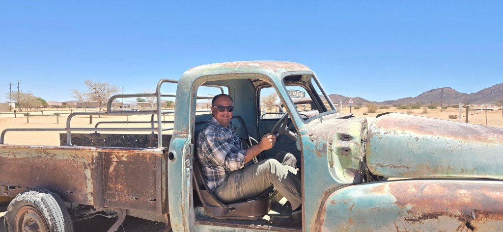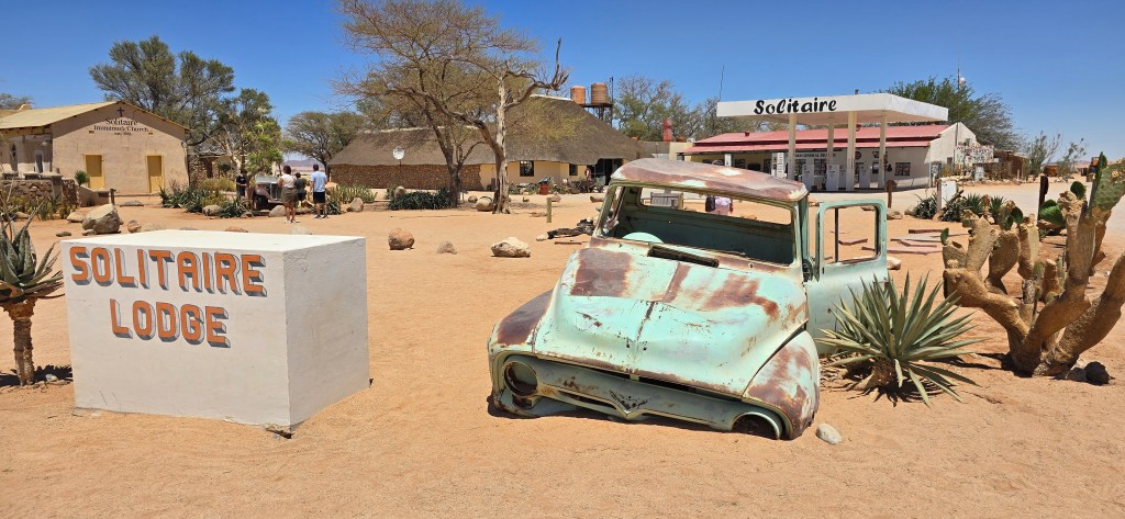 Roughly halfway through the journey, we stopped at Solitaire, a quirky outpost that has achieved near-legendary status among road trippers in Namibia. Calling it a “town” is generous—it’s really just a gas station, a small bakery, and a tire repair shop, but in a place where services are scarce, Solitaire is a vital pit stop. We refueled both our SUV and ourselves—grabbing some baked goods (the apple crumble here is apparently famous) and stretching our legs before continuing north.