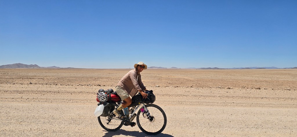 Just as we were leaving Solitaire, we spotted something unusual on the road ahead. As we got closer, we realized it was a man on a bicycle, riding in the opposite direction, alone, under the blazing sun, on a gravel track in the middle of the desert. It was surreal.