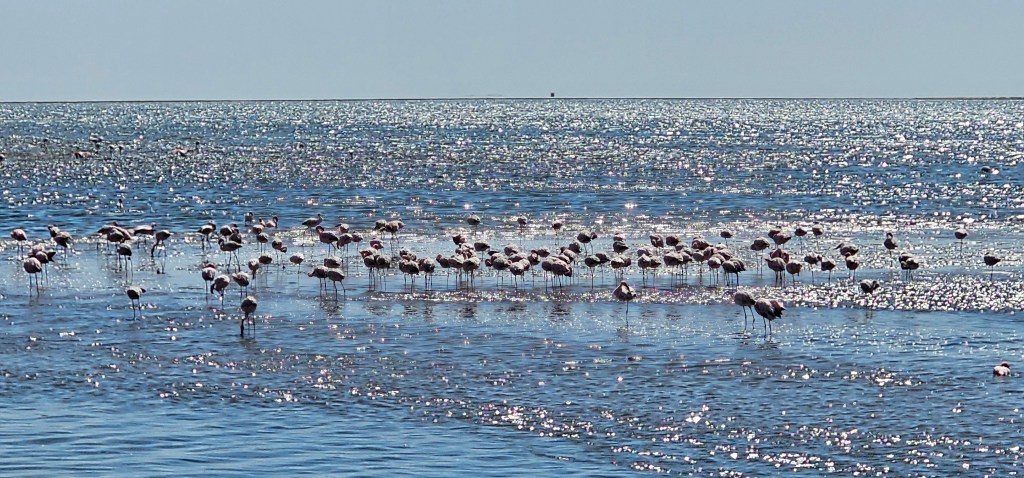 We made a quick stop at the Walvis Bay Lagoon, a well-known spot for flamingo sightings. As the sun dipped low, hundreds of flamingos waded in the shallows, silhouetted against a pastel sky—a perfect, relaxing scenery in stark contrast to the desert left behind.