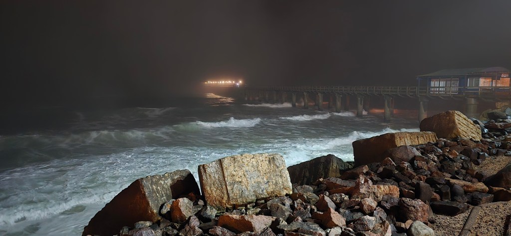 Later, Nausherwan and I went for a nighttime stroll to the historic Swakopmund Jetty, first built in 1905 during German rule. The Atlantic fog had rolled in, shrouding the coastline in a dense mist that made everything feel dreamlike.
