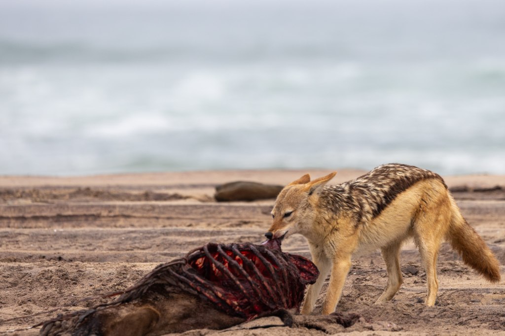 Tom also had a keen eye for wildlife. We spotted jackals in the distance, their silhouettes cutting across the dunes in search of food. Some were gathered near the beach, feeding on washed-up seals, a stark reminder of the harsh cycle of survival here. In the distance, we saw a lone oryx, Namibia’s national animal, gracefully navigating the dunes like it had done for centuries. These antelope, part of the bovid family, are incredibly well-adapted to life in this extreme climate—surviving without direct water sources, absorbing moisture from the plants they eat, and regulating their body temperature through specialized nasal passages.