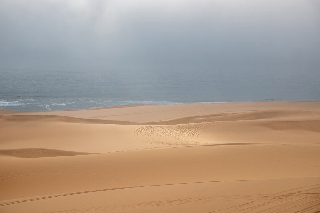 The constantly shifting dunes felt like an alien world—soft curves shaped by wind, their patterns changing with every gust. Occasionally, we would crest a tall dune and suddenly be met with a view that took our breath away: the endless desert rolling into the deep blue Atlantic Ocean. There are few places in the world where you can see such stark contrast—ocean meeting desert in a visual collision of blue and burnt orange.
